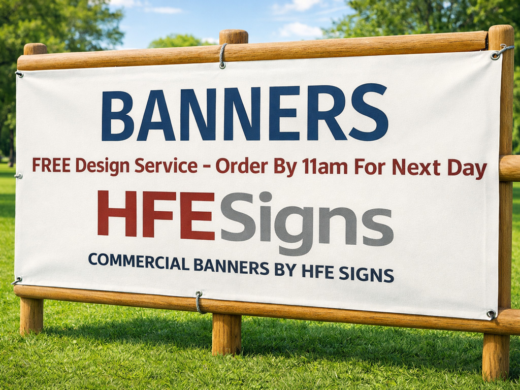 Promote your business, event or message with high-quality PVC banner printing from HFE Signs & Banners. Our custom printed vinyl banners are a cost-effective, durable and eye-catching solution for indoor and outdoor advertising across the UK.