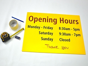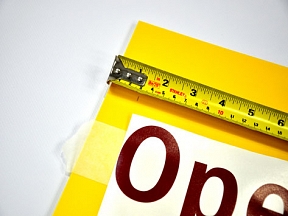Before commencing, establish exactly where the sign is to be located then tape the sign into position using small pieces of masking tape. Use 2" masking tape to create a hinge with half the masking tape on top of the sign and the other half on the application surface. Squeegee the masking tape hinge firmly into position. To apply, lift the sign away from the surface and fold back on the hinge. Peel off about 6 "of the backing paper then lower the sign keeping the adhesive away from the application surface. Starting at the top centre squeegee down and outwards towards each edge in turn. Remove another 6" of backing paper and keep repeating the process using overlapping strokes until the sign is completely applied (for large pre-spaced signs do as above but slit between each letter so that every letter can be applied individually). Now carefully remove the application tape diagonally at 90 degrees. Air bubbles can be removed by puncturing the bubble with a pin and squeegee the trapped air towards and out of the puncture. Finally re-squeegee the sign again paying particular attention to the top and leading edges. If the Sign is long and narrow, the same procedure can be adopted with the hinge on the edge of the sign instead of the top.