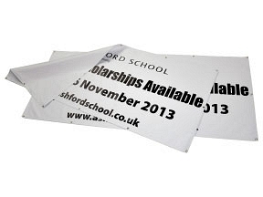 We understand that sometimes banners are only required for a short period of time and its hard to justify spending the money. Our solution to this is the HFE Mono Banners. Mono Banners are a cheap alternative and consist of nothing more than black text on a white background. The simplicity means we can print them faster, we don’t have to colour profile anything, design time is minimal and the ink cost is lower. The overall saving is passed on to the customer to enable us to offer cheap banners when a basic banner is sufficient.